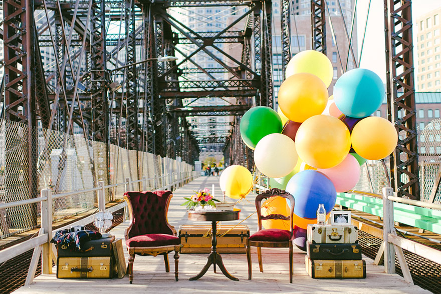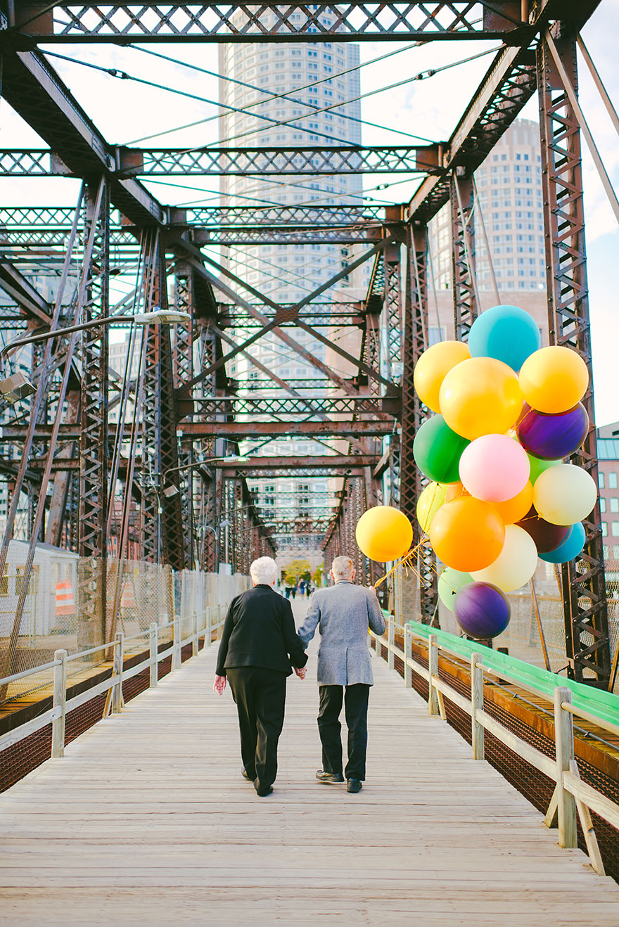 Lauren asked Cambria Grace, Pop & Circumstance and Wild Folk Studio to get together and help her with a unique gift to her husband’s grandparents. The couple holding colourful balloons, flower bouquets, briefcases and old books pose on a bridge – the setting that not only accurately resembles the beautiful movie, but also seems to symbolize the long and picturesque journey the couple have had together. Lauren says that Nina and Gramps have never taken their rings off and remain the best friends.