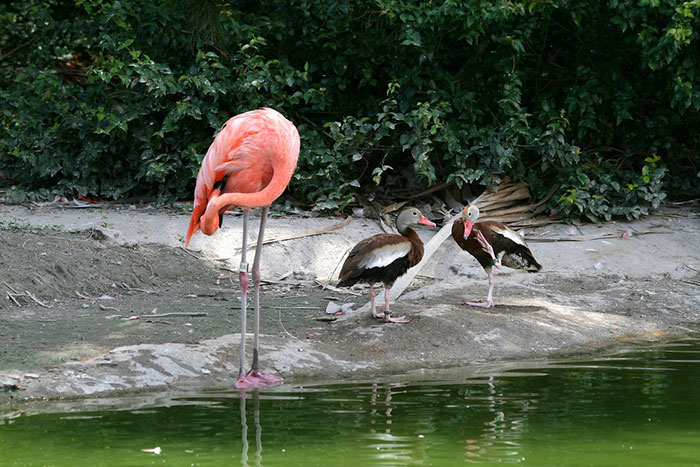 These must have been taken during the holiday season... NOBODY wants to eat a flamingo for Christmas dinner. Smart ducks indeed!