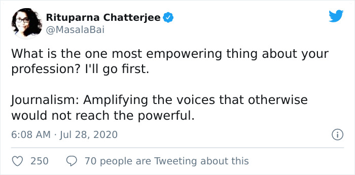 Recently, a Twitter user named MasalaBai asked other users of the platform to share one special thing about their occupation that feels the most empowering to them. "Beautiful replies that remind you why you chose the profession," she added. MasalaBai started by sharing a one-of-a-kind thing about her own profession. "Journalism: Amplifying the voices that otherwise would not reach the powerful," she wrote.