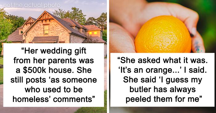 One time I asked a girl in my class if she wanted an orange. She said yes and I handed her one. She asked what it was. I was a little confused. "It's an orange..." I said. She said, "No, oranges don't have this rough skin, they're just sections that you break apart" I was shocked and explained that it was the peel and all oranges had them. She said "Oh, I guess my butler has always peeled them for me" She was 16 at the time. The entire class was furious.