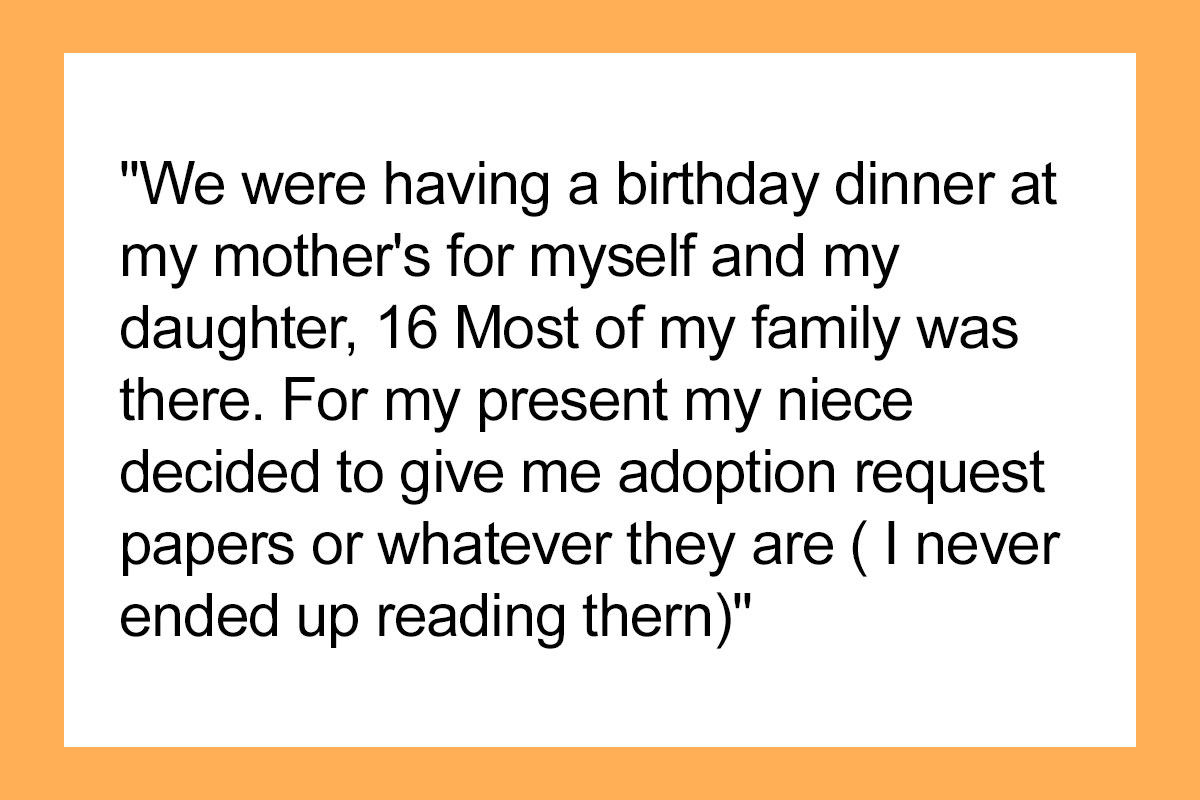 However, recently, during the OP’s birthday celebration with most of the family present, her niece surprised her by giving her adoption request papers, which was a total surprise. The woman didn’t know what to do, as it upset her own mother and other siblings.