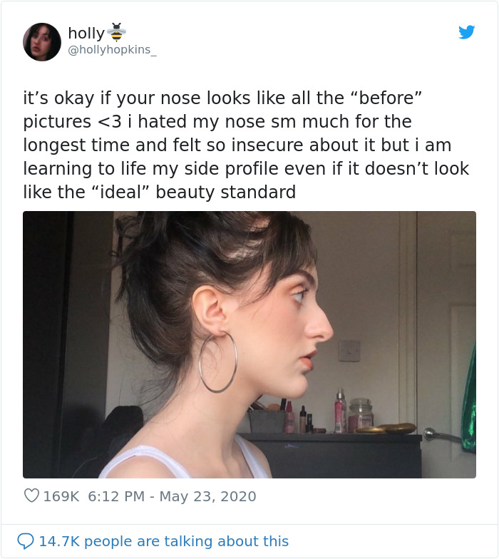 But 19-year-old Holly Hopkins got fed up with the so-called “ideal” beauty standards that promote polished side profiles. The truth is, they’re all too rare in real life. “It’s okay if your nose looks like all the 'before' pictures,” she stated in her now-viral tweet that got 169.4K likes. Many more people came forward celebrating their unique noses for what they truly are—totally charming, 100% natural and, and thanks to wise moms and dads, rhinoplasty-free.