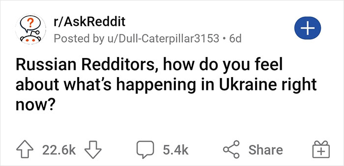 Meanwhile, the author of the emotional thread, u/Dull-Caterpillar3153, shared with Bored Panda how they feel about Russia invading Ukraine. "I personally think the situation is utterly horrible. This isn’t something that has been forced. They have chosen to go this way. They have chosen to take innocent lives. Sadly, many of the people in higher positions don’t care for human life in the way most of us do," the redditor said.