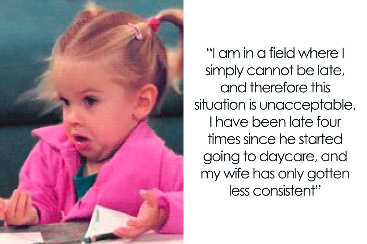 Load More Replies...She has ONE JOB……….. she is disrespecting his time and jeopardizing his employment. He’s working and she’s ungrateful for his sacrifice so she can stay home. I would have left on time as well. One job. One f’ing job. And it’s his fault ? No, lady Do your part. Why is the kid in daycare anyway?
