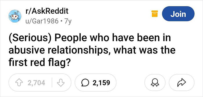 Someone asked “People who have been in abusive relationships, what was the first red flag?” and netizens shared their stories. A warning, some of the posts here are stories of domestic abuse. If you or anyone you know are going through violence at home, go to the hotline.org (if you are in the US) or the ncvd.org (for the UK).