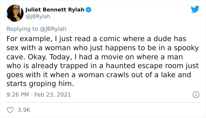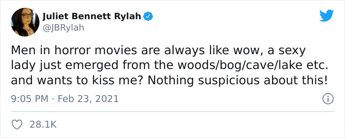 So, she went to Twitter to share some of her observations regarding this trope, saying “Men in horror movies are always like wow, a sexy lady just emerged from the woods/bog/cave/lake etc. and wants to kiss me? Nothing suspicious about this!”