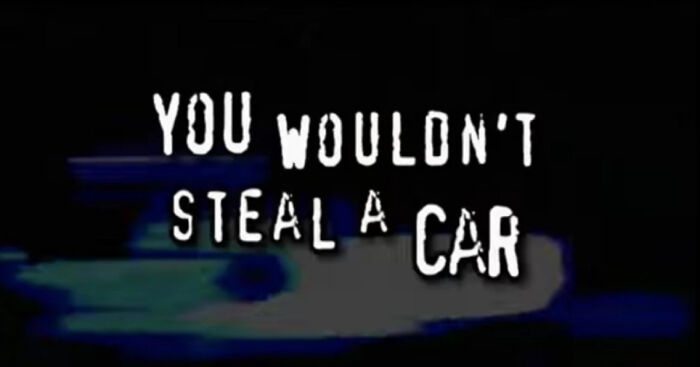 Vintage anti-piracy message saying you wouldn’t steal a car, part of nostalgic images from early DVD warnings.