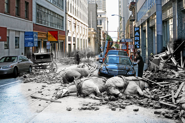 Nevertheless, Shawn created a striking series of photo manipulations, entitled “1906 + 2010: The Earthquake Blend”. Here are some of his interesting photos.