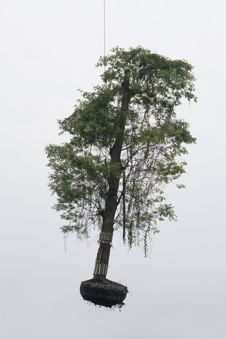 Three years ago I settled down in Wenjiang, and there is a tree nursery within walking distance of my home. Exotic trees and rocks from all over the world can be seen there, including Japanese black pines and maple trees. There are workers lifting these trees and rocks with mobile cranes every day, transporting them, and planting them in newly built parks, neighborhoods, or streets in the city. I walk through the woods and take photographs when the trees and rocks are being lifted into the air. Together, these images create The Sky Garden series."