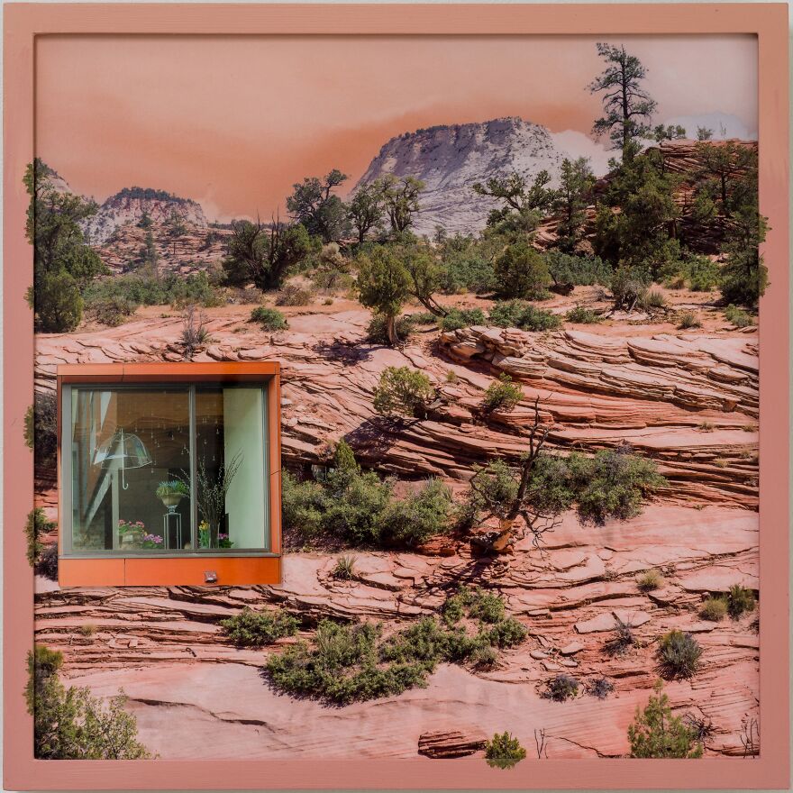 I feel an awe in the face of open landscapes and humanity seems small and insignificant. There have been thirty-seven epochs in Earth's history. We have been part of two. I mounted scenes of human habitation behind acrylic and affixed them within sweeping desert landscapes. The images push out onto hand-painted frames, alluding to the next chapter in the planet's history. In spite of human activity, the Earth continues to transform. Its inhabitants cannot escape its permanence, and the power it has to shape their existence. As nature reinvents itself, can we adapt with it?