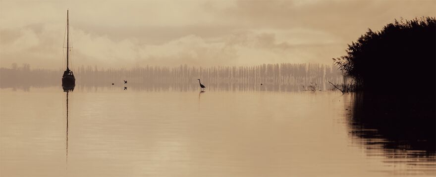 On some days everything seems to be arranged for the photographer, the warm light, a soft haze, fine colours and overwhelming atmosphere, the composition of subjects and last but not least a large egret, strolling curiously but calmly between the shore and the sailboat and thus underlines the tranquillity of the first morning light. The photo has been captured in Germany at Lake Constance in autumn 2022.