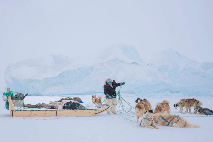 This photo was taken while traveling through a blizzard from Siorapaluk, the northernmost indigenous village in the world, to Qaanaaq, Greenland. We did not have a GPS, cell service, or the ability to communicate more than a few words in English. Our protection if we were to run into a polar bear was a rifle from 1940 and the fight within our 13 Greenlandic Huskies. We had to stop so my guide, Ilannguaq, could untangle the sled ropes. The dogs watched on and patiently waited until they could get back to doing their favorite thing in the world - running.