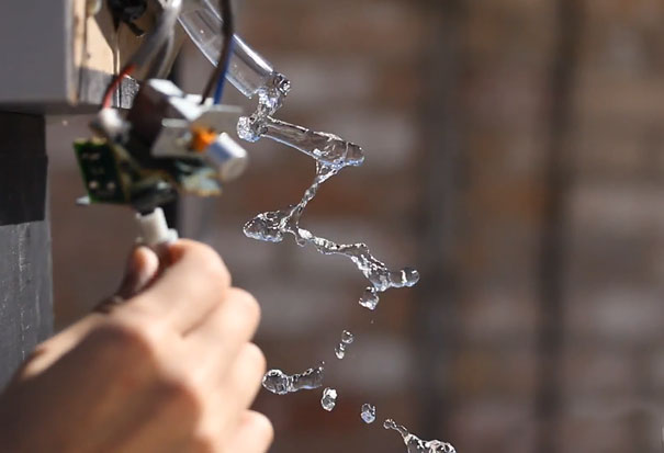 Unfortunately, the trick is that you can only see it through a 24 fps camera. The installation consists of a water hose that’s attached to a speaker with 1 or 2 inches hanging down, so that when the speaker produces sound, it vibrates the hose as well. An audio cable is attached from the computer to the speaker and the sound software is adjusted to 24 hz. When Brusspup turns on the music and the water, the result he sees through his camera is water running down in the shape of stairs and spirals. You can get different results if you set the frequency to 23 or 25hz as well!