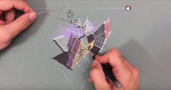 Architect Reza Asgaripour knows a genius hack that could take the perspective game of your drawings to another level. Reza fixed an elastic string on 3 fixed points and manipulated them with a paperclip, creating perfect straight angles for his building sketch. Pass this video to all tech drawing students!