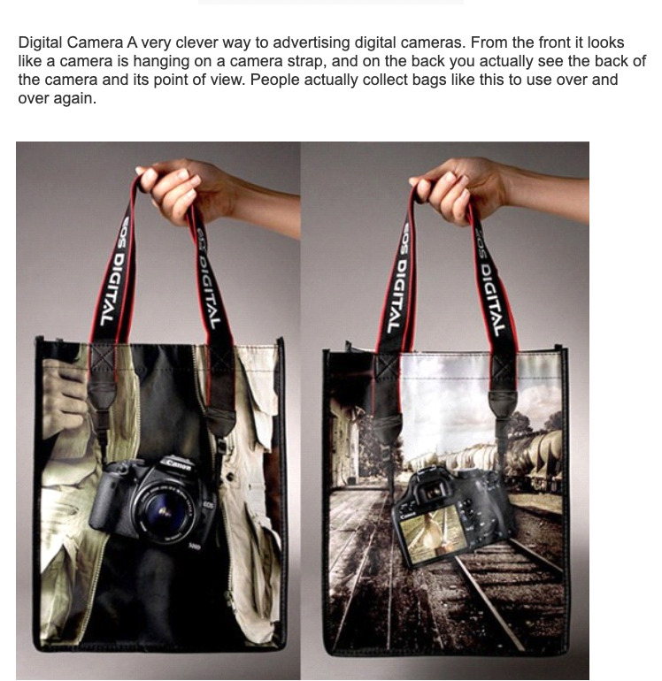 Digital Camera: A very clever way to advertising digital cameras. From the front it looks like a camera is hanging on a camera strap, and on the back you actually see the back of the camera and its point of view. People actually collect bags like this to use over and over again. https://baklol.com/baks/Misc/24-Most-Creative-Bag-Ads-_1620/Digital-Camera-_20056 Screen-Sho...4b-png.jpg