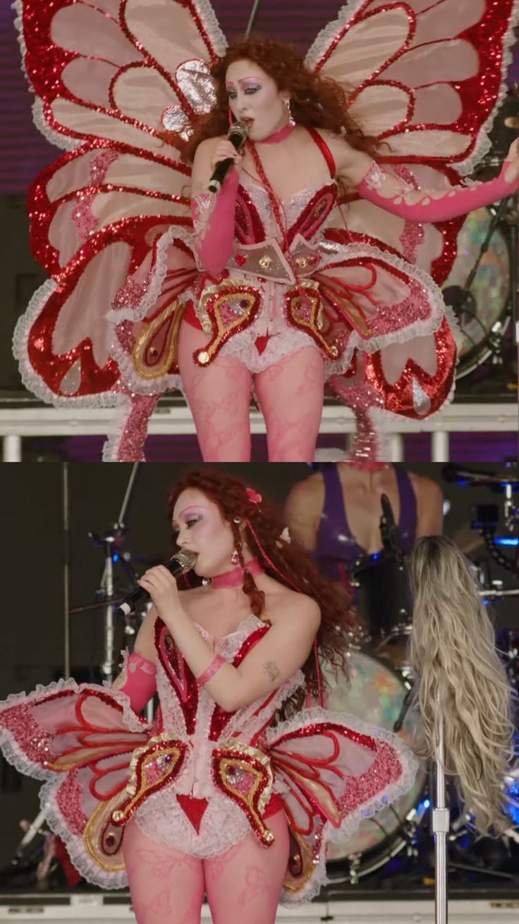 The pop star donned a low-cut, chest-baring jumpsuit that sat somewhere between chic fashion experiment and theatrical costume.