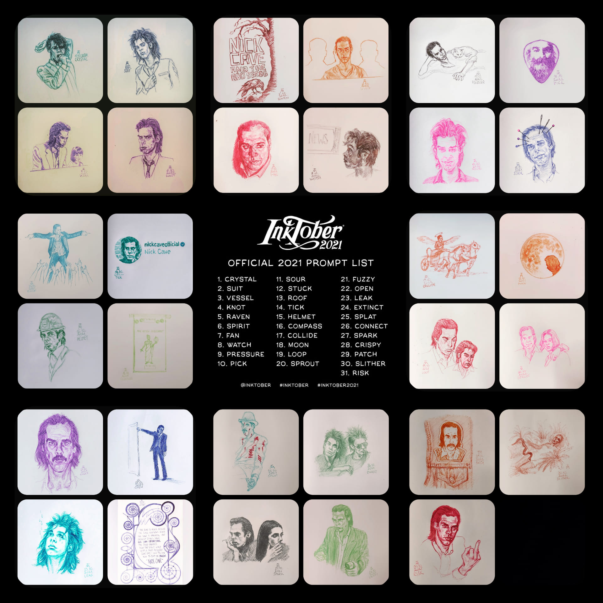 Inktober is a drawing challenge – to draw every day of October, with ink, based on a pre-set list of prompts. In order to challenge myself even more, this year I made it all about the brilliant, multitalented legend, Nick Cave, whose career, spanning more than 4 decades, provided more than sufficient inspiration even connected to the most random prompts.