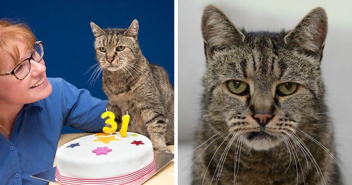 This tabby kittie, who is a contender to be the world’s oldest cat, has just celebrated his 31st birthday (that’s a cat age equivalent of 141 in human years). His name is Nutmeg and he chose his humans by showing up in their backyard some 26 years ago. ”He rules the house and he’s absolutely gorgeous,” Nutmeg’s humans told The Mirror.