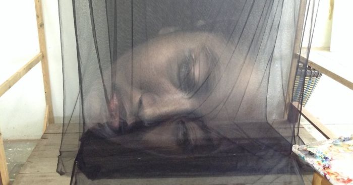 33-Year-Old Thai artist Uttaporn Nimmalaikaew paints haunting, 3d-images on fine netting. He discovered the technique by accident in 2001 when, while studying at Silapakorn University in Bangkok, he noticed a spot of paint on his mosquito netting. Nimmalaikaew soon realized that he could create the impression of depth and volume by combining multiple layers.