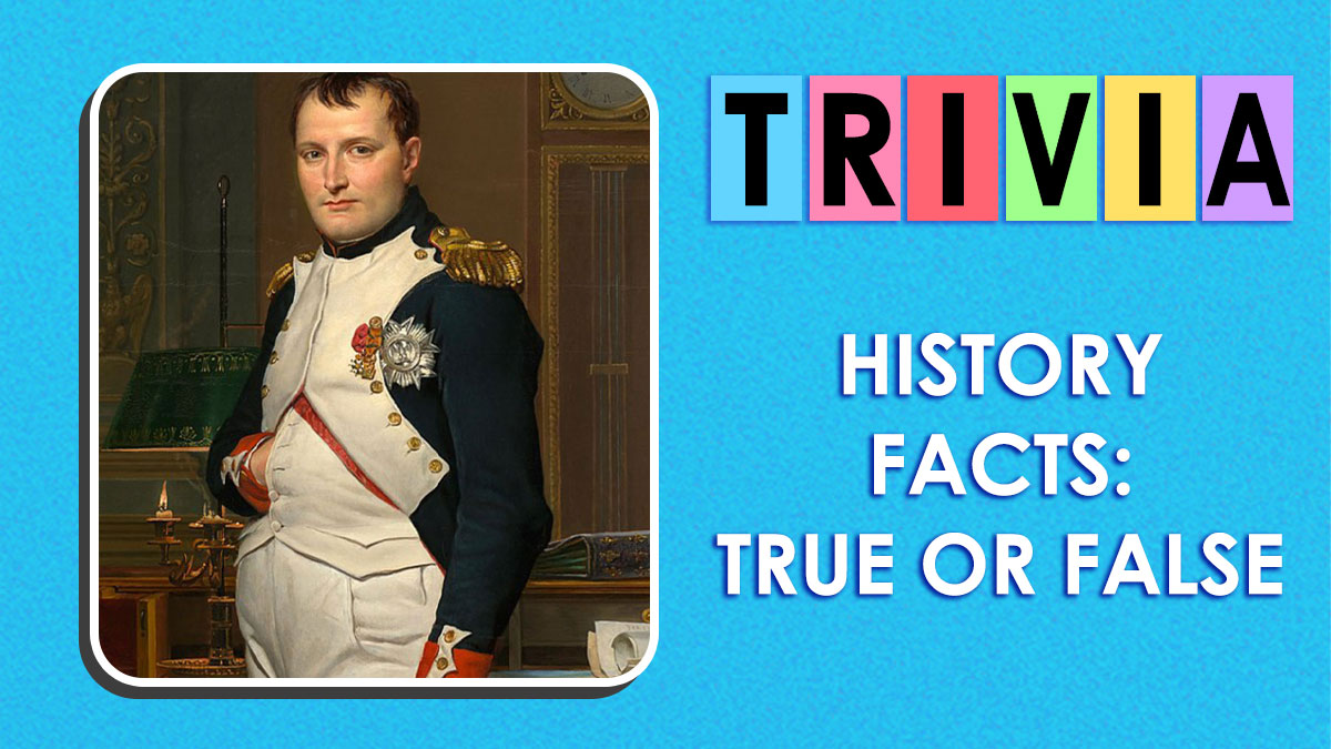 Portrait of Napoleon with colorful trivia letters and text about history facts true or false quiz on blue background.