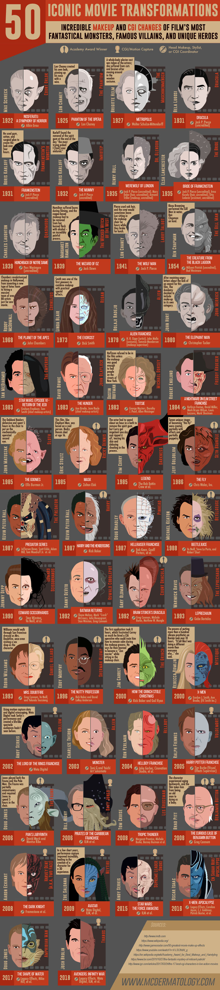 This graphic explores some of the most well-known movie character transformations in the last 100 years of cinema. Some involve special effects makeup, while others were created using CGI. All are fascinating!