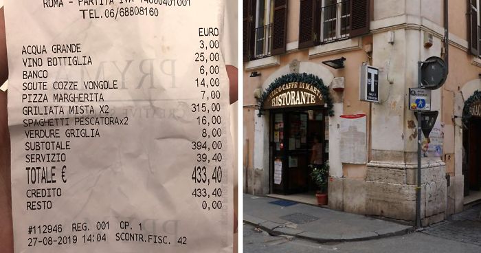 Load More Replies...Been to Rome a few times, the argument because they ate fresh fish is BS. If it's not fresh or has ever been frozen they must label it as such. I think the most I've ever spent on a meal there is 80EU for both me and my wife with desert and wine. If anyone tries this, you should refuse to pay and tell them to call the police. Consumers have rights in every EU country.