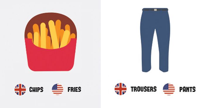 The UK and the USA were once referred to by George Bernard Shaw as "two countries divided by a common language". To this day, Brits and Americans continue to misunderstand and confuse each other. Thankfully, Grammar Check has put together a handy infographic comparing 63 British words to their American counterparts, and it needs to go viral for the sake of communication.