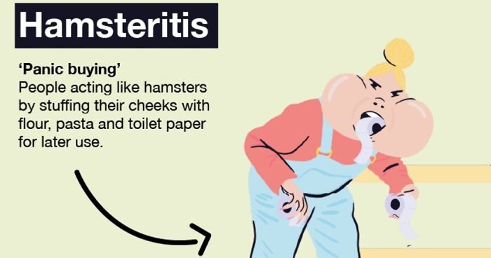 People acting like hamsters by stuffing their cheeks with flour, pasta and toilet paper for later use.