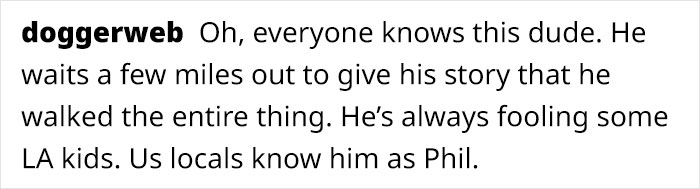 Others made jokes that made me giggle. “He was 23 when he got started! Maps and compass, people!” said one. “Here I am out of breath going up 2 flights of stairs…” remarked another. Lastly, one even made up a special scenario fit for a Netflix show: “Oh, everyone knows this dude. He waits a few miles out to give his story that he walked the entire thing. He’s always fooling some LA kids. Us locals know him as Phil.”