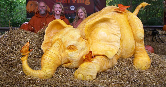 This massive 900lb pumpkin carving at the Bronx Zoo was designed and carved by Pumpkin Sculpt USA to help bring attention to the organization 96 Elephants, which works to bring attention to the fact that 96 African Elephants are killed each day for their ivory and to support legislation to help save them. Pumpkin carving is an ephemeral art form which only lasts a few days, which would help remind people that once the elephants are gone, they are gone for good.