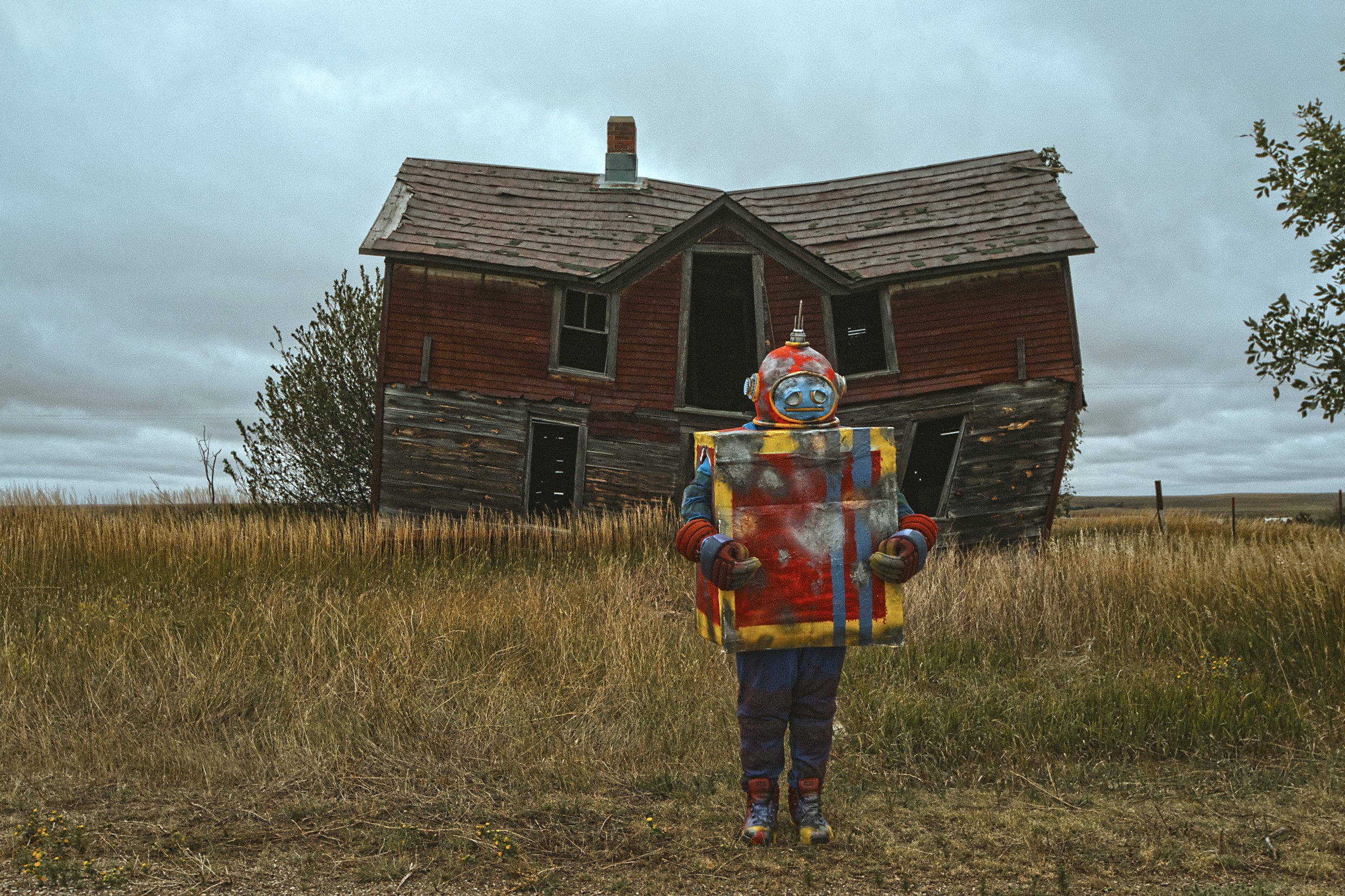 I spent a week crafting a costume that looked like a rusted toy robot for my boyfriend to wear, and in the fall of 2020, we took a 2 week roadtrip out in the Midwestern United States where I photographed him in different locations wearing the costume. We drove 8,000 miles in 15 days. Because of Covid, we slept in the car a lot and tried to avoid staying in motels/hotels as much as possible. Some nights we got no sleep (we treated ourselves to a hotel stay and sleeping in a couple times during our trip).