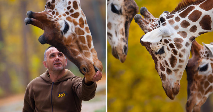 One such zookeeper, working in a zoo in Skopje, Macedonia, has found an incredible connection with the biggest animals kept there - giraffes. The cute giraffes always follow him around, lovingly licks him and trusts him completely, while also making great opportunities for zoo animal pictures. Looking at them it seems that a zookeeper job is probably a dream job!