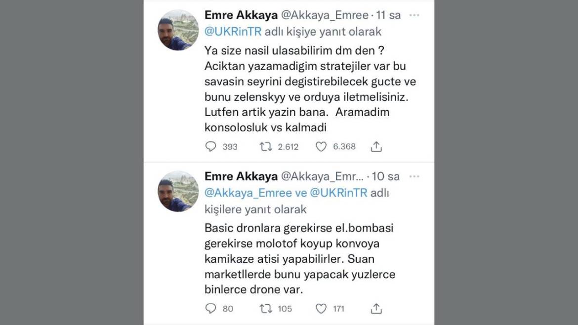 A Turkish guy named Emre Akkaya posted a tweet. He’s been trying to reach Ukrainian officials about his idea. He did not get any response till Turkish media and social media users started to make fun of him. Then he announced his idea, he says, “Now the Russian forces are in reach for the ordinary drones which can be purchased from any market, so load them with molotovs or homemade bombs and let hell loose.”