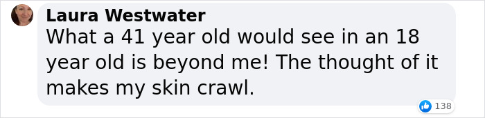 I will never think a 41-year-old person being in a relationship with an 18-year-old is okay. It's grooming, it's disgusting, I don't care how long they've been together, I don't care if it's technically legal. It's gross. I'm 28, I can't look at people ten years younger than me in a romantic way. And I don't think I should be able to.