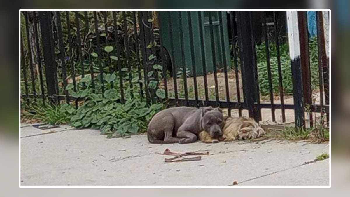After arriving there, the woman found two pups there – a big pit bull and a tiny Yorkie mix, snuggling together