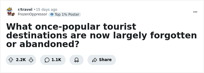 It all started a few days ago, when the user u/FrozenOppressor asked netizens in the AskReddit community to point out several tourist places that were once very popular, but are now largely forgotten or even abandoned.