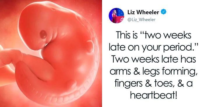 Conservative commentator Liz Wheeler, pictured above, is a strong proponent of the law and has made it a personal mission to “expose liberal hypocrisy” when it comes to abortion. She recently tweeted the image of a six-week-old embryo alongside the words “This is “two weeks late on your period.” Two weeks late has arms & legs forming, fingers & toes, & a heartbeat!”