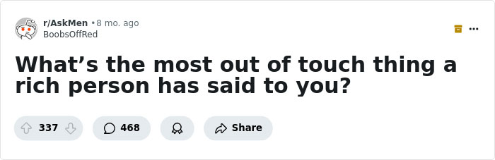 When someone asked, “What’s the most out-of-touch thing a rich person has said to you?” the replies were astounding. From the downright ignorant to the plain old rude, you’d be forgiven for wanting some of these folk to take their private jets and go inhabit a planet far, far away. Bored Panda has put together a list of the most bizarre statements to come out of the mouths of those with a golden spoon. A few might make you want to gag. We also spoke to WalletHub's financial writer and analyst Chip Lupo to get some tips for those who'd like to build some wealth of their own.