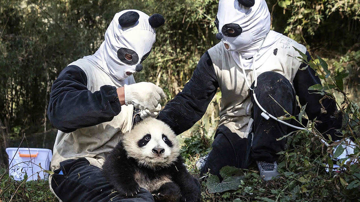 Two people in panda costumes with a real panda, pretending to belong in a forest setting.