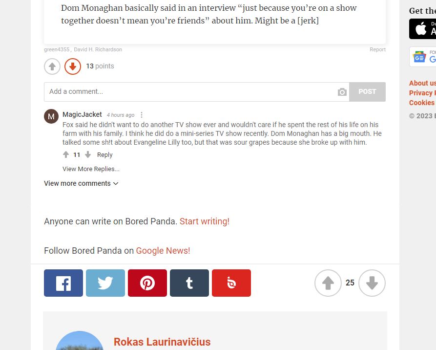 Fox said he didn't want to do another TV show ever and wouldn't care if he spent the rest of his life on his farm with his family. I think he did do a mini-series TV show recently. Dom Monaghan has a big mouth. He talked some sh!t about Evangeline Lilly too, but that was sour grapes because she broke up with him.