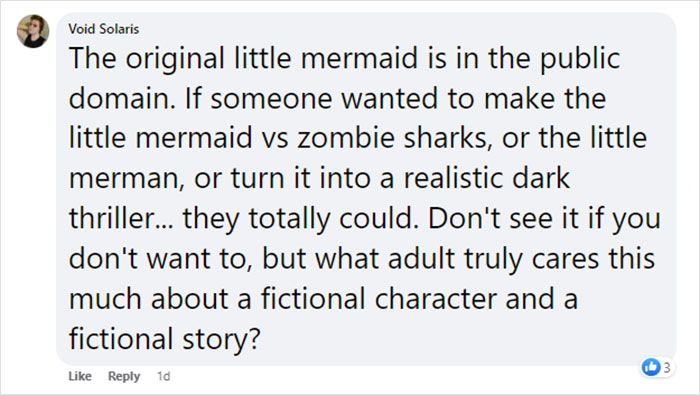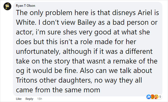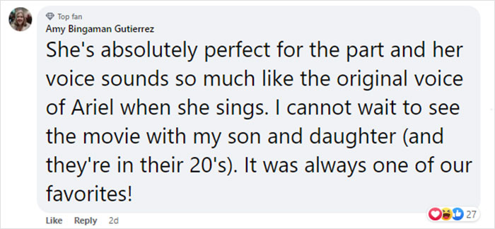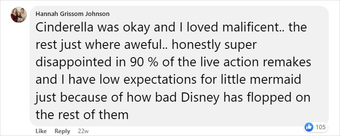 Load More Replies...My bestie just came back from seeing this movie with her daughter, who is a HUGE Disney's Little Mermaid fan, and they ADORED it. They said it was SO GOOD, and all the changes were for the better--developing the romance more so it wasn't so much love-at-first-sight, explaining Ursula's backstory more, changing how Ursula dies. The only thing they didn't like was Scuttlebutt's rap, but they said everything else was FANTASTIC. That Halle Bailey was at LEAST as good a singer as Jody Benson (voice of the animated Ariel) and that Melissa McCarthy delivered a fantastic performance as Ursula. I'm looking forward to seeing it.
