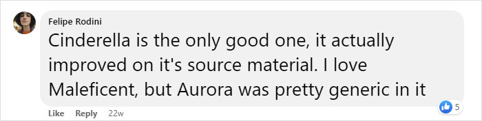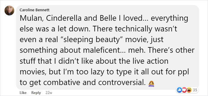 Load More Replies...This list quickly derived from Disneys live adaptations to comparing Disney animated adaptations to live action adaptations of the same fairy tale (or legend in Mulans case) that are completely unrelated to Disney. What the... these were not all Disney movies and Disney does not own the original tales they based their animations on...
