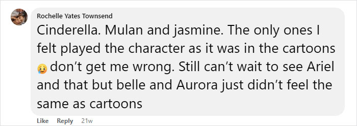 Load More Replies...“From what I've seen, I find that Disney fans are generally burnt out from all the remakes and would prefer to see more original stories or new adaptations that incorporate the animated art form,” Lisa went on to note. “I'm particularly excited about Wish, which is coming out this November and is meant to pay tribute to a century of Disney animation. It will feature a new heroine/princess named Asha who embarks on a quest to save the magical kingdom of Rosas from a wicked king. I've also heard rumors of an animated Disney adaptation of ‘The Princess and the Pea’ in the works, which has been attempted by other studios in the past.”