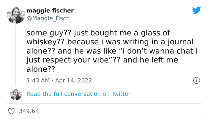 Creative and radio host Maggie Fisher has recently gone to Twitter with one such act. Namely, a guy approached her, got her some whiskey, told her he respects her vibe, and left, leaving her quite perplexed. And, what is more, her post soon went on to become extremely viral on Twitter, currently carrying nearly 350,000 likes with a bit over 14,000 retweets.