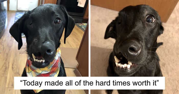 “I got Felix as an 11-day old puppy. I was the rescue worker who was called in by the breeder after they noticed that one of the puppies from their litter was not thriving, and was, in fact, dying because he had a severe cleft palate and cleft lip, and was not able to nurse off of his mother properly,” Jamie, Felix’s rescuer and the owner shared with Bored Panda. “He had developed aspiration pneumonia at this point and was not going to live another 24 hours. I took him home with me and tube-fed him for the next 7 weeks. I treated his pneumonia as well. He is now a 14-month-old adult Black Lab!”