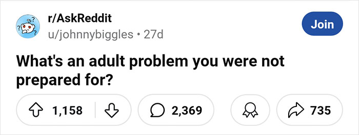So when someone on Reddit asked, “What’s an adult problem you were not prepared for?” there was no shortage of responses. Some shared their disdain for the amount of household chores they suddenly had to deal with, while others became aware of the fatigue brought on by making important life decisions.