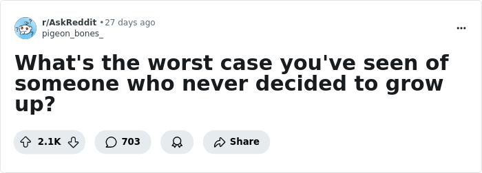 However, not everyone hears it. On Reddit, a user named Pigeon_Bones_ opened a conversation about the worst cases of people who never managed to grow up. From mooching off parents to throwing tantrums, the discussion has become a sad and cringey catalog of missed opportunities and wasted potential. But who knows, maybe these folks can still turn it around.