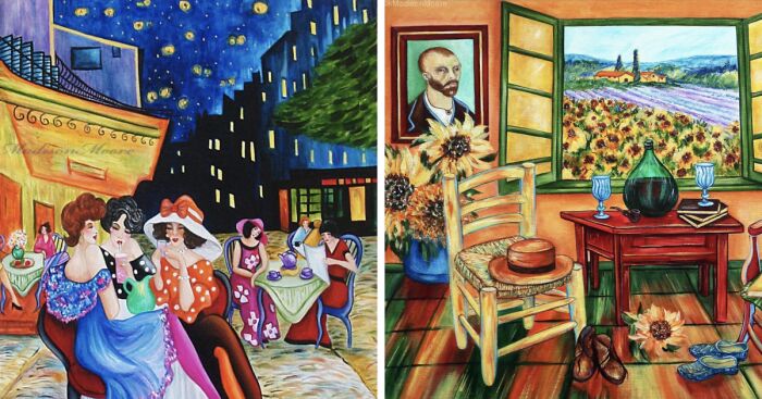 I enjoy reading and researching famous pieces of work like van Gogh’s Cafe Terrace at Night for example. At the same time, I was maybe also checking out some facts about Tarkay or Gauguin. Then the magic suddenly happens I see a composition reimagining Tarkay’s Ladies sitting at Vincent’s Cafe on a girl's night out. A painting is created and a vision is completed. The title is Tarkay Visits van Gogh's Cafe Terrace at Night.