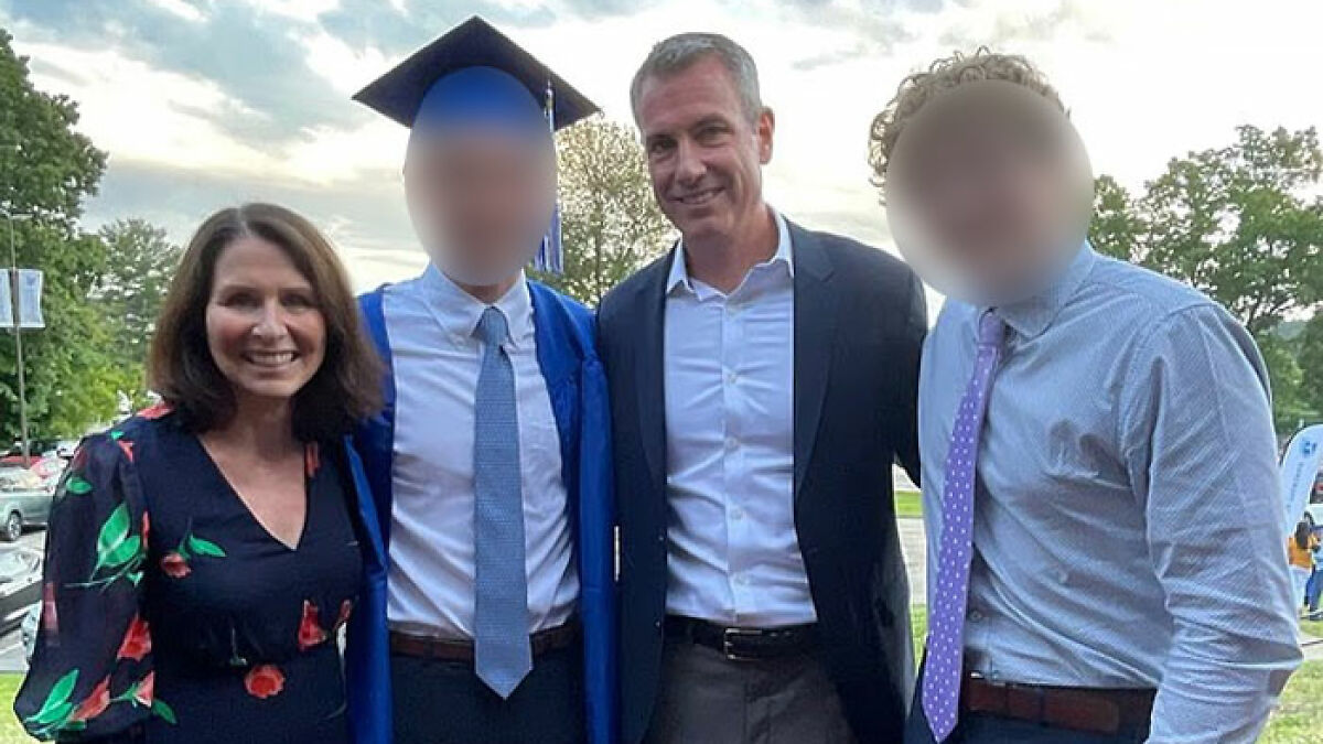 Woman and three men outdoors at graduation, related to CEOu2019s wife and HR chief divorce rumors after kiss cam humiliation.
