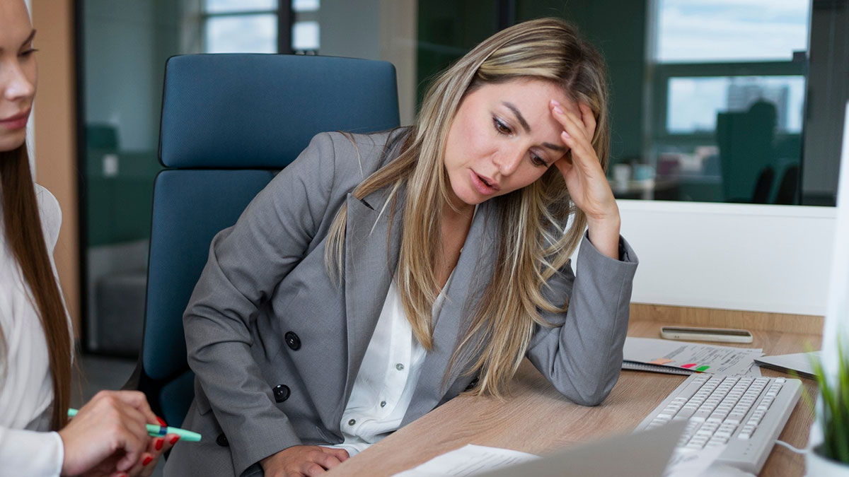 Stressed graphic designer in office reviewing work, highlighting issues with agency stealing years of creative work.